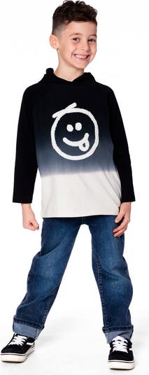 Lends one-of-a-kind style to this hooded raglan top. Super soft in stretch organic cotton jersey, this long sleeve tee features contrast raglan sleeves, a solid hood, a curved back hem, and a large graphic print on the chest.