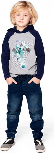 Lends one-of-a-kind style to this hooded raglan top. Super soft in stretch organic cotton jersey, this long sleeve tee features contrast raglan sleeves, a solid hood, a curved back hem, and a large graphic print on the chest.