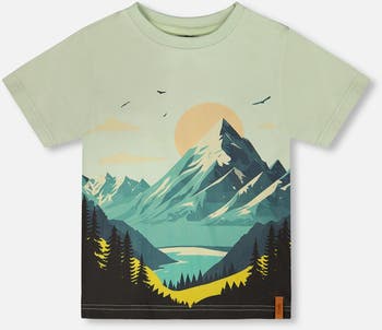 The organic cotton jersey t-shirt with mountain print sage is perfect for adding a fun vibe to everyday outfits. This short-sleeve tee features a round neckline and a gorgeous mountain and lake landscape printed on the chest, bringing a playful and trendy touch. Crafted from soft organic cotton with a hint of stretch, it ensures all-day comfort while being part of our “B.O.Y.S.” collection.