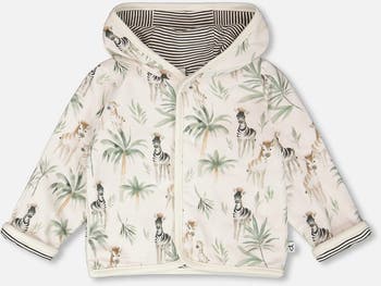 A jacket that flips from playful to practical, this organic cotton jersey reversible hooded jacket beige with zebra print is a true wardrobe favorite for little boys. One side shows off a lively allover zebra jungle scene, while the other keeps it classic with timeless stripes. Designed in soft and stretchy organic cotton jersey, it’s finished with a cozy hood and front snap closure for easy everyday wear. Pair it with other cozy items from our "Under The Baobab" collection.