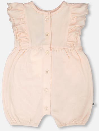 The organic cotton jersey romper with frills peach is a light and playful outfit for baby girls. This sleeveless bodysuit features delicate frills along the shoulders, a front button placket, and gathered hems for extra sweetness. Crafted in soft organic cotton jersey with a hint of stretch, it ensures comfort and breathability for summer play. A poetic piece from our "Savannah Whispers" collection to brighten the season.
