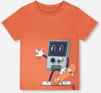 The organic cotton jersey t-shirt with print in orange adds a playful touch to everyday outfits. This short-sleeve tee features a bold video-game-and-skate chest graphic print for an extra-cool vibe that boys will love. Soft organic cotton jersey with a hint of stretch makes it comfy and breathable for all-day wear.