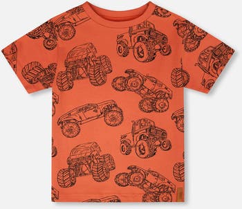 The organic cotton jersey t-shirt in orange with printed trucks is a playful basic for boys who love adventure. This short-sleeve tee showcases a fun monster truck allover print that bring movement and style to the look. Crafted in soft organic cotton jersey with a hint of stretch, it ensures breathability and all-day comfort.