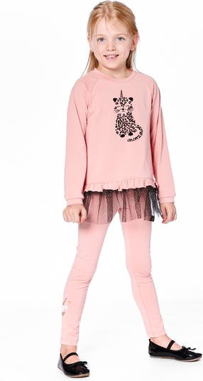 The Organic Cotton Leggings in Dusty Pink With Unicorn Print add a playful touch to everyday outfits. These stretchy jersey bottoms are crafted from a soft blend of organic cotton and elastane, featuring a comfy elastic waistband and whimsical glittery unicorn graphics near the ankles. Perfect for pairing with tunics or tees from the “Unicorns And Hearts” collection for magical playtime style.