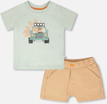 This t-shirt and short set in mint green and beige is perfect for little adventurers. The short-sleeve t-shirt features a playful monkey driving a jeep print, with shoulder buttons for easy dressing, while the beige shorts come with front pockets and an elastic waist for a practical touch. Made from soft organic cotton blend, this set offers both comfort and style for sunny day explorations.