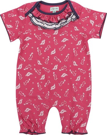 This romper has short sleeve arms & legs that are perfect for summer baby style and features seahorse print. Super soft, gentle to delicate skins and sustainable to the environment too! Popper fastening to legs and envelope neckline for easy dressing. Makes a perfect gift for new additions to the family. Soft elastication to cuffs for a pretty silhouette and gorgeous contrasting inserted frill detailing!- Made from 100% GOTS certified organic cotton- Nickel-free popper fastenings- Gorgeous frill sleeves- Lilly & Sid logo tab to hem
