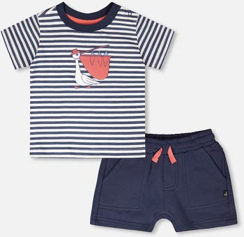 The organic cotton t-shirt and short set in blue stripes and blue brings playful seaside vibes to everyday adventures. This set includes a soft short-sleeve jersey t-shirt with blue stripes background and a cute pelican print on the chest, paired with solid blue woven shorts designed with practical pockets and an elastic waistband with contrasting orange drawstring. A breezy duo from the "Coastal Days" collection, made for comfort and style under the sun.