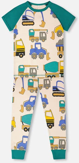Bedtime builds excitement with trucks in this organic cotton two-piece pyjama set in beige with truck print. This set features a t-shirt with short contrasting raglan sleeves and a playful truck print on the chest, while the matching pants show the same allover truck pattern with fitted contrasting cuffs for comfort. Crafted in soft 100% organic cotton, this cozy set from the “Starry Night” collection is perfect for little builders.