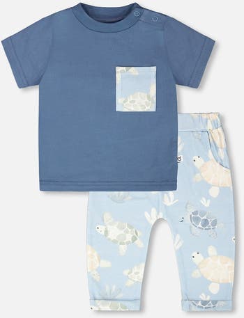 Playful and comfy, this organic cotton jersey t-shirt and pants set in medium blue and blue with turtle print is made for adventurous little ones. The top features a chest pocket with a fun contrast turtle print and snap buttons at the shoulder for easy dressing. The matching pants with an allover turtle print include an elastic waistband for a perfect fit.