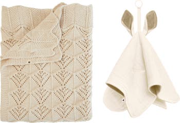 Baby can stay cozy with this sweet set featuring a neutral, wavy knit blanket and snuggly kangaroo-inspired cuddle cloth—both cut from soft organic cotton.