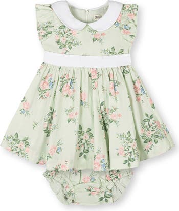 Our adorable dress in soft organic cotton sateen features an adorable peter pan collar to frame her face with simple charm. Features a woven collar, flutter sleeves, and a waist sash with bow at the center back. Zipper closure at center back. Comes with matching diaper cover. Ready for every picture perfect moment.