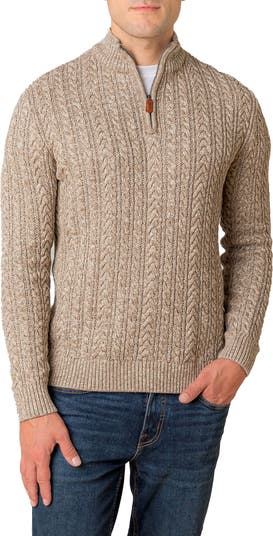 Our handsome half zip sweater has an easy fit that's perfect for layering when cool weather hits. Crafted from soft organic cotton in a beautiful cable knit design. Features a rib knit mock neck, front half zip for easy-on and off, and faux leather zipper pull. Pairs perfectly with our organic cotton button downs.