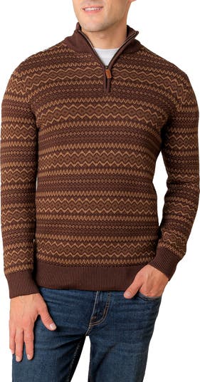 Our handsome half zip sweater has an easy fit that's perfect for layering when cool weather hits. Crafted from soft organic cotton in a beautiful fair isle intarsia design. Features a rib knit mock neck, front half zip for easy-on and off, and faux leather zipper pull. Pairs perfectly with our organic cotton button downs.