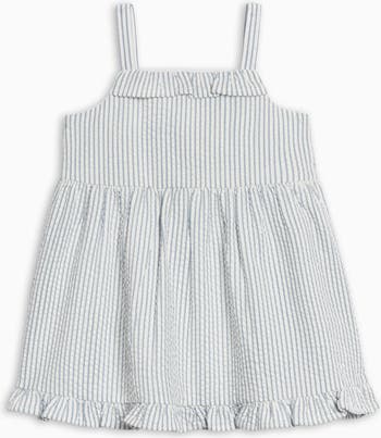 The Juliette Seersucker Tank Dress is made for sunny days and twirls in the warm breeze. With its sweet ruffled square neckline and bow-tie straps at the back, this dress brings playful charm to every outing. A gathered waist and flouncy hem keep the fit light and comfy, while infant sizes include a coordinating diaper cover for easy, all-in-one dressing.