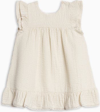 The Lorena Seersucker Double Ruffle Sleeve Dress is a sweet, warm-weather favorite made for sunny days. Featuring a classic round neckline and soft gathering at the yoke, this dress offers an airy, comfortable fit. Double ruffle sleeves add playful movement, while the ruffle hem finished with delicate crochet scallop trim brings just the right touch of charm. A simple button-back opening makes dressing easy, and infant sizes include a coordinating diaper cover for added convenience.