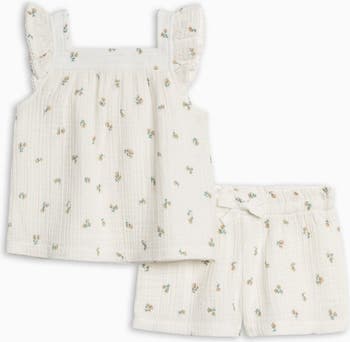 The Louise Muslin Tank and Short Set is a breezy, warm-weather favorite designed for comfort and charm. The flutter ruffle tank features a square neckline with delicate picot stitching and soft gathering for an easy fit. Paired with matching ruffle-edge shorts and a functional waist tie, this set is perfect for playdates, picnics, and sunny-day adventures.