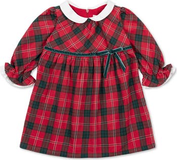 A classic silhouette crafted from soft organic cotton calvary twill will be your girl's go-to piece for picture time. This pretty dress features a crisp peter pan collar, long sleeves with double layer ruffle cuffs, and a zipper closure down the center back. A stunning holiday dress to make memories in.