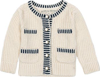 Our sophisticated sweater cardigan in soft organic cotton is elevated by a beautiful tweed-like stitch. Features delicate puff sleeves, gold button closure, front patch pockets and welt pocket detail, and contrast trim. This piece pairs perfectly with our collection of organic cotton tops, skirts, and dresses for a polished look she'll love.