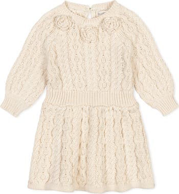 Your girl will be so chic and comfortable in our soft organic cotton cable knit sweater dress. Features a beautiful allover stitch, hand knit rosettes at the neckline, comfry raglan sleeves, and a gold button at the back keyhole closure. An absolutely darling look that is perfect for the holidays and beyond.