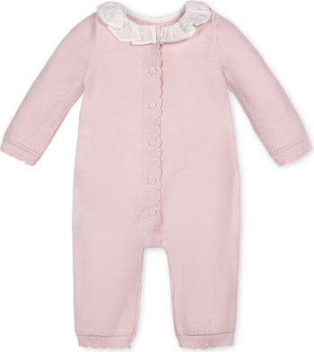 A gently textured knit sets this sweater romper apart from the rest. Crafted from our luxuriously soft organic cotton, this one-piece features a sweet ruffle collar, button front center closure and scallop edge rib trim. Small stitch details at the sleeve cuffs and ankles. An easy, comfortable, and beautiful outfit in one. Makes a great baby gift.