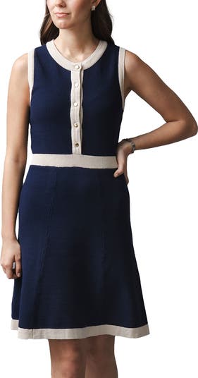 Exude sophisticated charm in our soft organic button front sweater dress. Features an allover textured tweed stitch, a center front placket with gold buttons, contrast rib trim, and a full skirt. A stylish (and comfortable) look you can wear all year.