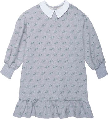 Our Organic Sweatshirt Dress in Heather Grey features a faux shirt collar, drop-shoulder design, and hidden pockets ensure an effortlessly cool and comfortable fit. Adorned with an all-over Trumpet Sonatine print.