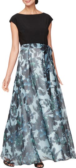 A waist tie and cap sleeves help craft this stunning gown, complete with an organza patterned skirt.