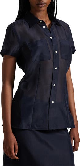 Cut from crisp lightweight organza, this semisheer shirt is framed by abbreviated sleeves and fronted with chest pockets.
