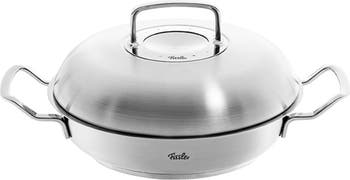 - SUPERIOR PERFORMANCE: Featuring the Fissler Novogrill surface, a waffled frying surface for perfect searing with minimal fat, our serving pan also includes a condensate plus metal high dome lid for tastier results, extra-large pouring rims, ergonomic side handles, and interior measurement markings for precise cooking. Oven safe up to 450°F and dishwasher safe for easy maintenance, this pan ensures efficiency in every kitchen task.