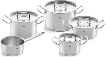 Celebrating 50 years, the Original-Profi Collection is one of the world's most successful, award-winning stainless steel cookware lines. Sustainably crafted in Germany from up to 90% recycled 18/10 stainless steel, chef-inspired features include hygienic rivet-free construction, an energy-efficient CookStar base, extra-large pouring rims, condensate-plus metal lid to trap in moisture for tastier results (metal lid sets) or full view energy saving glass lids (glass lid sets), and interior measurement markings, making it a standout in design and functionality. The 9 piece set includes a 2.2, 4.2, and 6.7 quart stock pot with metal lids, 2.7 quart rondeau with metal lid and a 1.5 quart saucepan with metal lid.