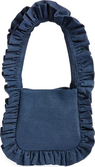 A dramatically ruffled perimeter brings delightful volume to this statement-making tote made from satin-finish twill with a water-resistant finish.