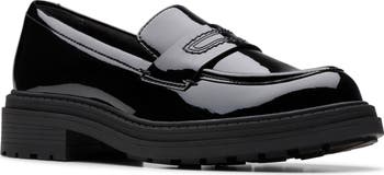 High shine patent leather defines a timeless loafer set on a low block heel and finished with a grippy lugged sole for traction and support.