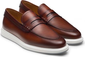 A slim penny keeper and burnished leather upper add modern sophistication to a cushioned loafer grounded by a durable rubber cupsole.