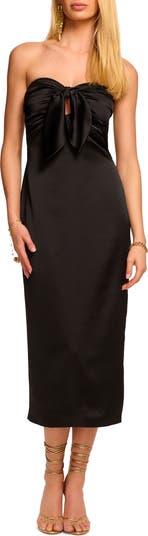 A front keyhole and tie detail provide a flirty finish for a strapless midi dress in a streamlined silhouette.