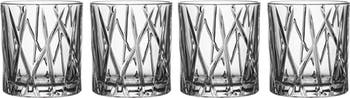 A textured diamond lattice adds contemporary, architectural style to a modern quartet of sparkling crystal bar glasses that won't slip in your hand.