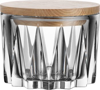 Dramatic diamond cuts give a distinctively contemporary look to a crystal bowl with a fitted wood top. It's suitable for holding food items as well as your favorite trinkets.