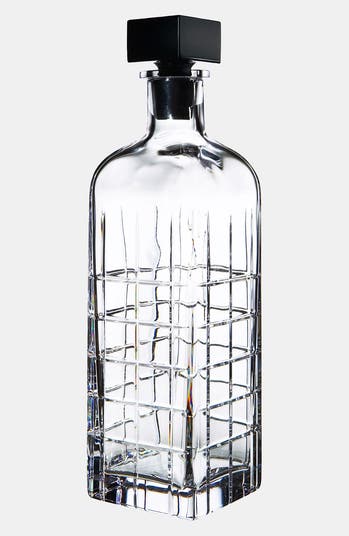 A square black stopper crowns the top of a hand-cut crystal decanter with a grid pattern inspired by uptown-Manhattan streets.