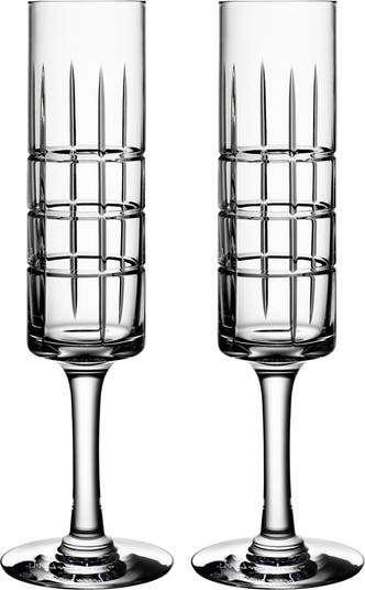 Hand-cut grids inspired by uptown Manhattan streets style a pair of stately crystal champagne flutes designed by Jan Johansson.