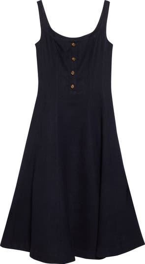 The label's sophisticated French-American fusion that blends Parisian refinement with American practicality and ease informs the impeccable tailoring of this midi dress that's fitted through the bodice then flares out to a voluminous skirt. It's structured from a textural linen blend, with shapely seams at the waist and signature knotted buttons that amplify the vintage inspiration with a golden gleam.