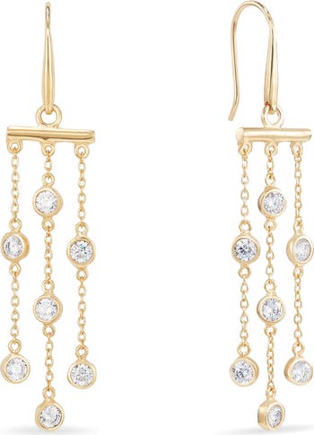A collection of bezels are filled with lab-grown white topaz in these dainty drop earrings plated in 22-karat gold.