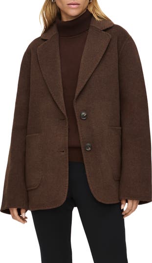 Tonal pickstitching outlines the oversize silhouette of a wool-forward coat rendered in a luscious chocolate shade.