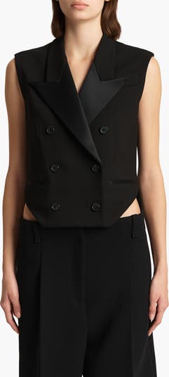 Catherine Holstein reimagines the formal tailcoat with her signature eye for louche toughness in this runway-featured double-breasted vest. It's tailored from stretch suiting with satin peaked lapels and a standout cutaway hem with a classic tails back.