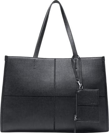 Multidirectional stitching highlights the structured profile of a voluminous leather shopper bag featuring a roomy interior and optional zip pouch for easy organization.