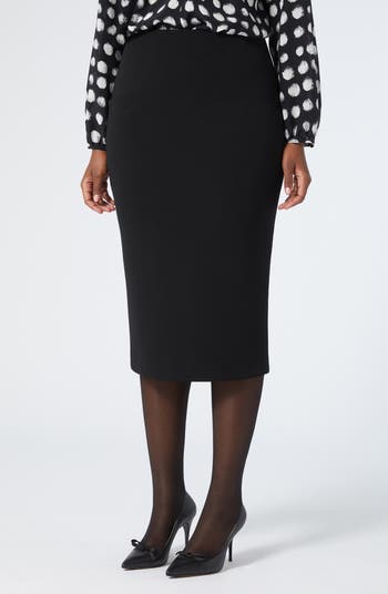 An elevated staple skirt is shaped in a pencil silhouette and cut from a soft cady fabric.