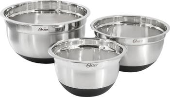 Marinate, prep, mix, and store ingredients in this 3 piece Oster Oswalt mixing bowl set with non slip bases. Constructed of Stainless steel for long lasting durability and elegance. Each bowl features nonslip bases that provide stability so you can mix without fear of tipping over and spilling your ingredients. Stackable design for space saving storage, these dishwasher safe bowls check all the boxes when it comes to versatility and convenience!