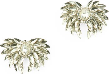 Angelic shine defines wing-inspired earrings featuring shining tiers and crystal centers.