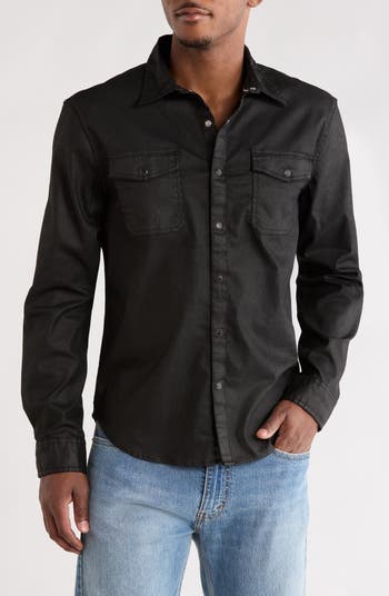 Coated black cotton with a touch of enhanced stretch takes you late into the night in a shirt with pointed pocket flaps and gleaming snaps cinching its classic Western spirit. Wear it smooth, rumpled, tucked or untucked to change up your look without ever removing your boots.