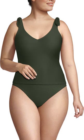 This simple yet stylish V-neck tankini features a flattering neckline that accentuates the bust and faux shoulder ties for a touch of interest. The textured fabric is soft and chlorine resistant, plus it has UPF 50 protection built right in. Pair it with matching rib bikini bottoms for the perfect swim look.