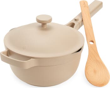 The mini version of the original nonstick Perfect Pot is ideal for small spaces and makes for easy cooking of smaller meals and side dishes. The exclusive nontoxic, nonstick ceramic coating is made without potentially toxic materials like PFOAs, PTFEs, other PFAs, lead, cadmium, toxic metals and nanoparticles. A nesting beechwood spatula with an integrated spoon rest completes the set and keeps counters tidy, too.