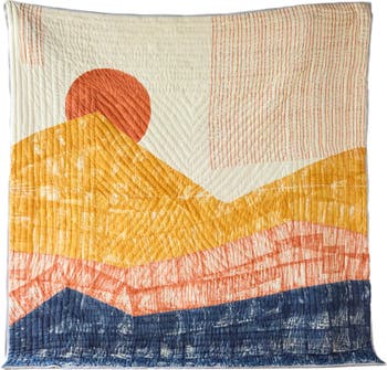 This reversible, hand-printed quilt embodies minimalist modern aesthetics: one side showcases black abstract shapes on a wheat base, while the reverse highlights abstract shapes in orange and brown on a yellow backdrop. Each quilt is handmade from 100% cotton and requires attention from four artisans, including wood carvers, block printers, quiltmakers, and dye specialists. The design is hand-pressed onto each quilt using hand-carved wooden blocks dipped in dyes. The printed cotton shells are brought to the homes of quiltmakers, who stuff and stitch the quilts by hand, creating the final product. CQC LA quilts are made in small batches. Due to the handcrafted nature of this item, expect slight variations in the appearance of each unique piece.